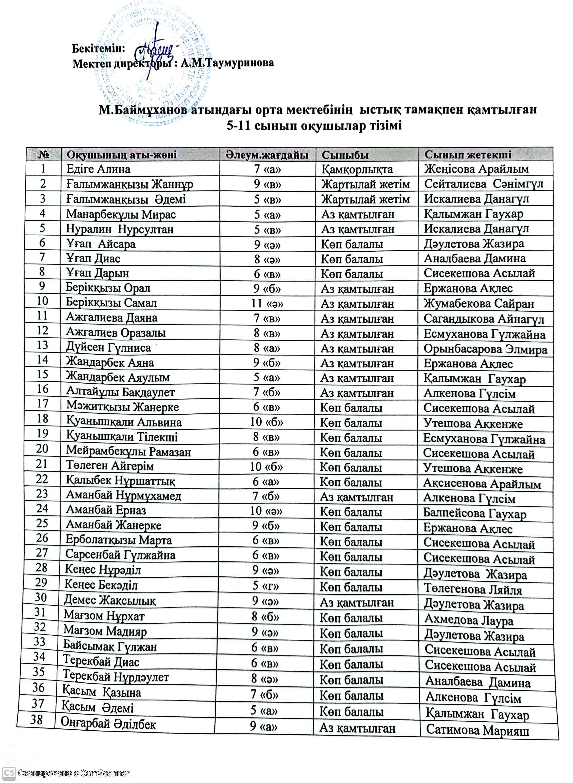 Муса Баймұханов атындағы орта мектебінде санитарлық- эпидемиологиялық талаптарын сақтай отырып,асханада антисептик,ауа тазартқыш орнатылып,оқушы тамақтанатын үстелдердің ара қашықтығы 2 метр сақталған.Асхана алдында қол жуғыш,қол кептіргіш бар. ЖК «Исмагамбетов» пен келісім шарт жасақталды.Мектебімізде барлығы 898 бала білім алуда.1-4 сыныптар 386 оқушы,5-11 сыныптарда 512 оқушы.Мектеп бойынша аз қамтылған 87 оқушы.Оның 1-4 сыныптарда 45 оқушы,5-11 оқушы 42 оқушы.