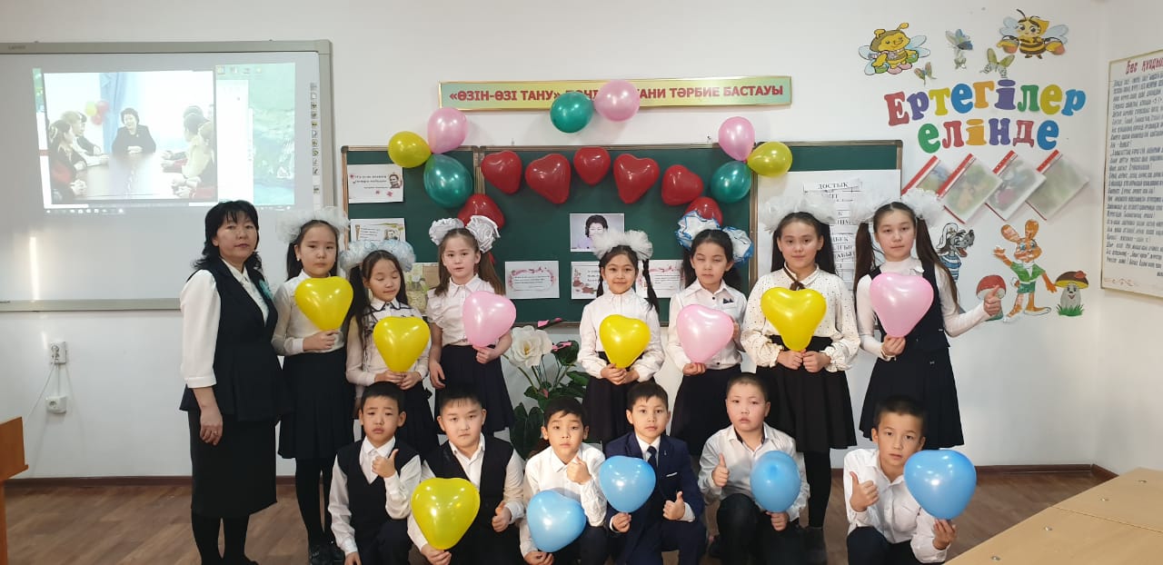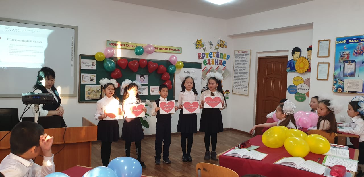 М.Баймұханов атындағы орта мектепте Өзін-өзі тану пәні мұғалімі Аналбаева Дамина «Сүйіспеншілік-өмір негизі» атты ашық сабақ өткізді.Мақсаты :оқушыларды сүйіспеншілік жалпыадамзаттық құндылығы туралы түсініктерін қоғамға қызмет етудің мәні мен мағынасын ашу. Сабақта Сара Алпысқызы туралы видио фильм көрсетіліп ,сурақтарға жауап берді.Топтық жұмыстар жүргізіліп топпен кұндылықтар әні айтылып балалар керемет әсерде болды.
