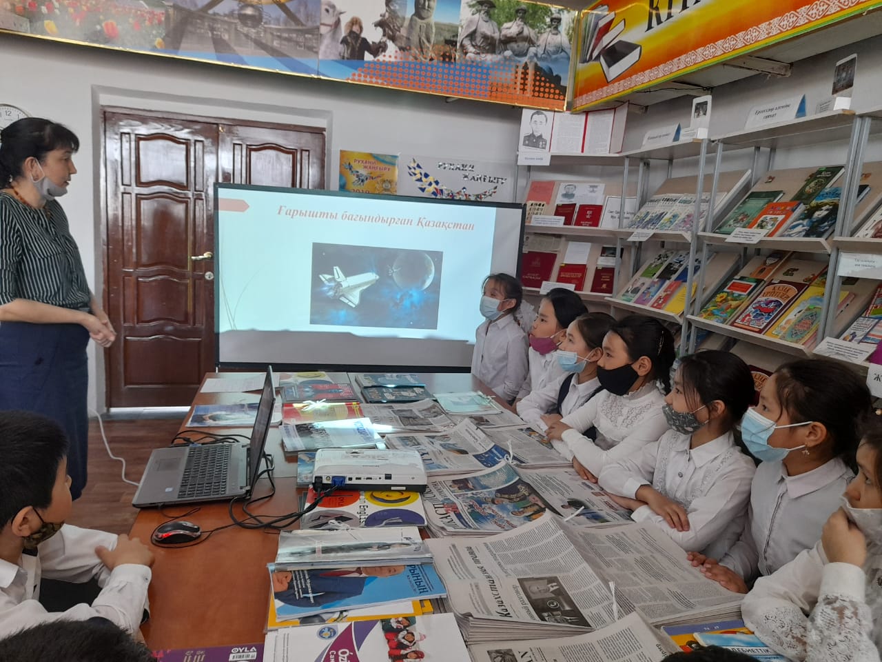 "12 сәуір Халықаралық ғарышкерлер күніне" орай 2021 жылдың 8 сәуір күні мектеп кітапханашылары А.Койшығұлова мен А.Мұхамбетованың ұйымдастыруымен "Ғарышты бағындырған Қазақстан" атты тақырыпта танымдық сағаты өткізілді.